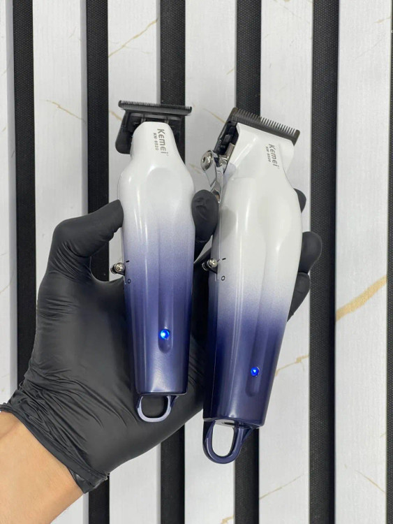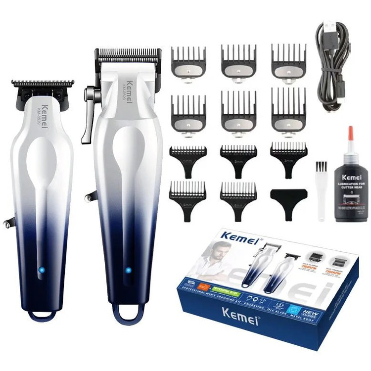 ست ماشین اصلاح حرفهای کیمی مدل Kemei KM-8529 شامل حجمزن با دور موتور 7000 دور در دقیقه با زمان کار 180 دقیقه و خطزن 7800 دور در دقیقه با زمان کار 150 دقیقه، مجهز به باتریهای لیتیومی قدرتمند (حجمزن 2500 و خطزن 2000 میلیآمپر)، مناسب برای اصلاح دقیق و حرفهای در منزل و سالنهای آرایشی.